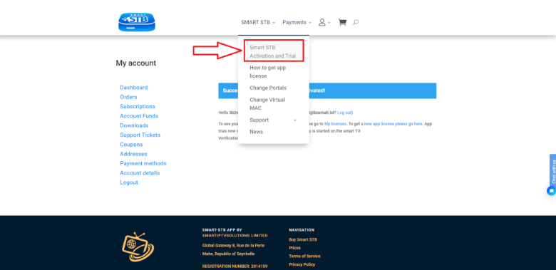 Une fois que vous avez cliqué sur le lien reçu par e-mail, vous serez redirigé vers la page de votre compte. À ce stade, dans le menu, veuillez choisir l’option « Activation et essai de Smart STB ».