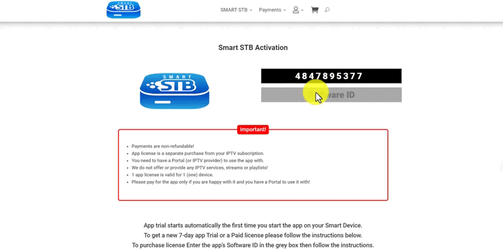 Vous pourrez récupérer votre SOFTWARE ID à cet emplacement dans l’application Smart STB.